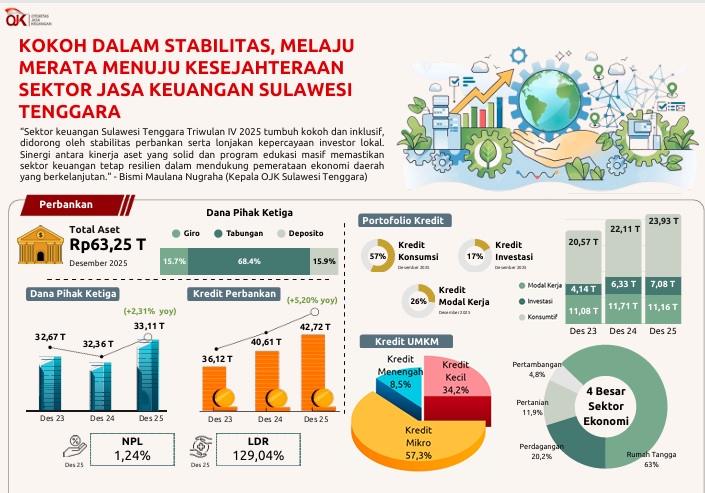 Sepanjang tahun 2025, sektor perbankan di Sulawesi Tenggara menunjukkan resiliensi yang kuat dengan total aset mencapai Rp63,25 triliun pada posisi Desember 2025. Dana Pihak Ketiga (DPK) tercatat sebesar Rp33,11 triliun atau tumbuh 2,31 persen secara tahunan, yang didominasi oleh tabungan sebesar 68,4 persen, deposito 15,9 persen, dan giro 15,7 persen.